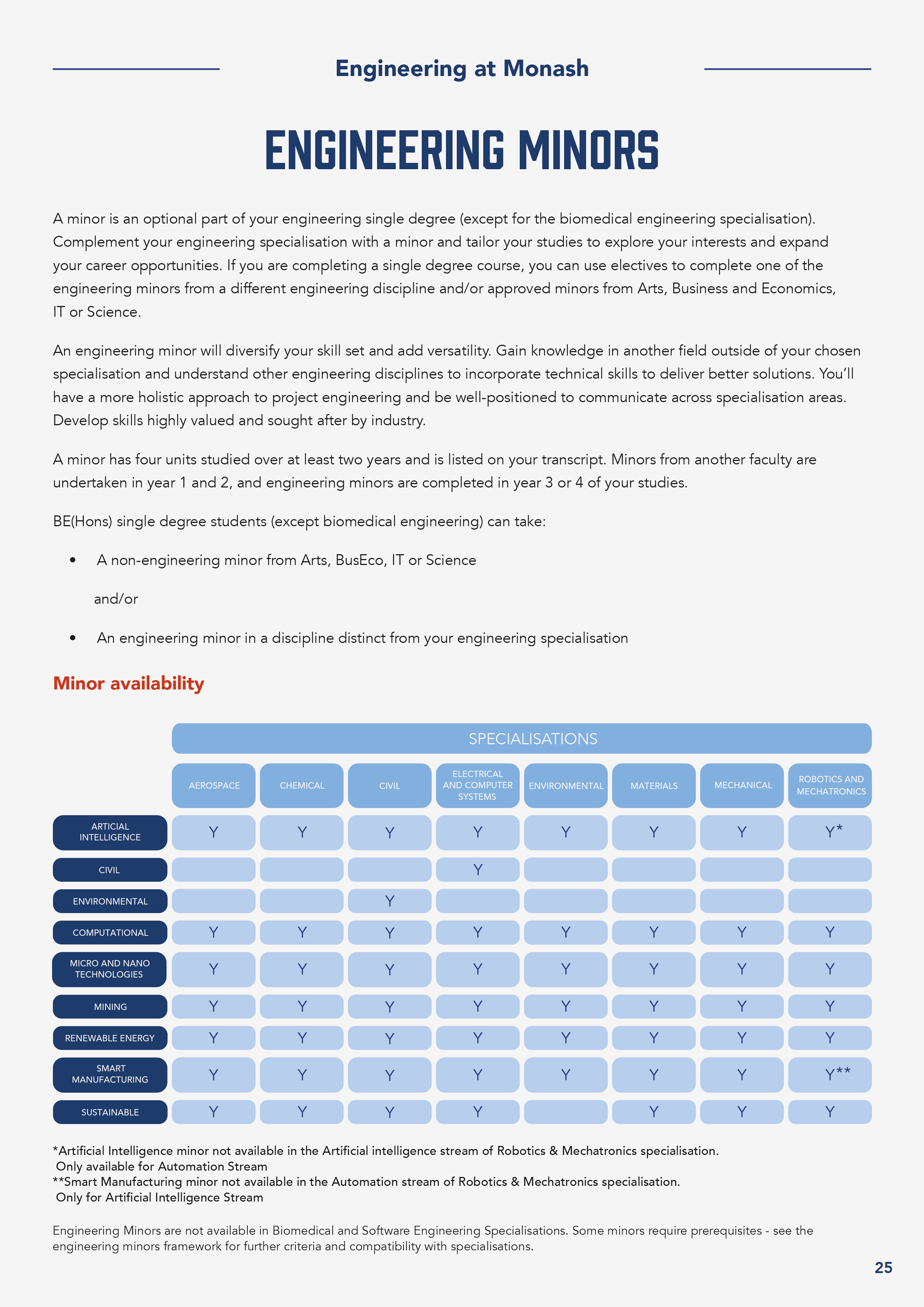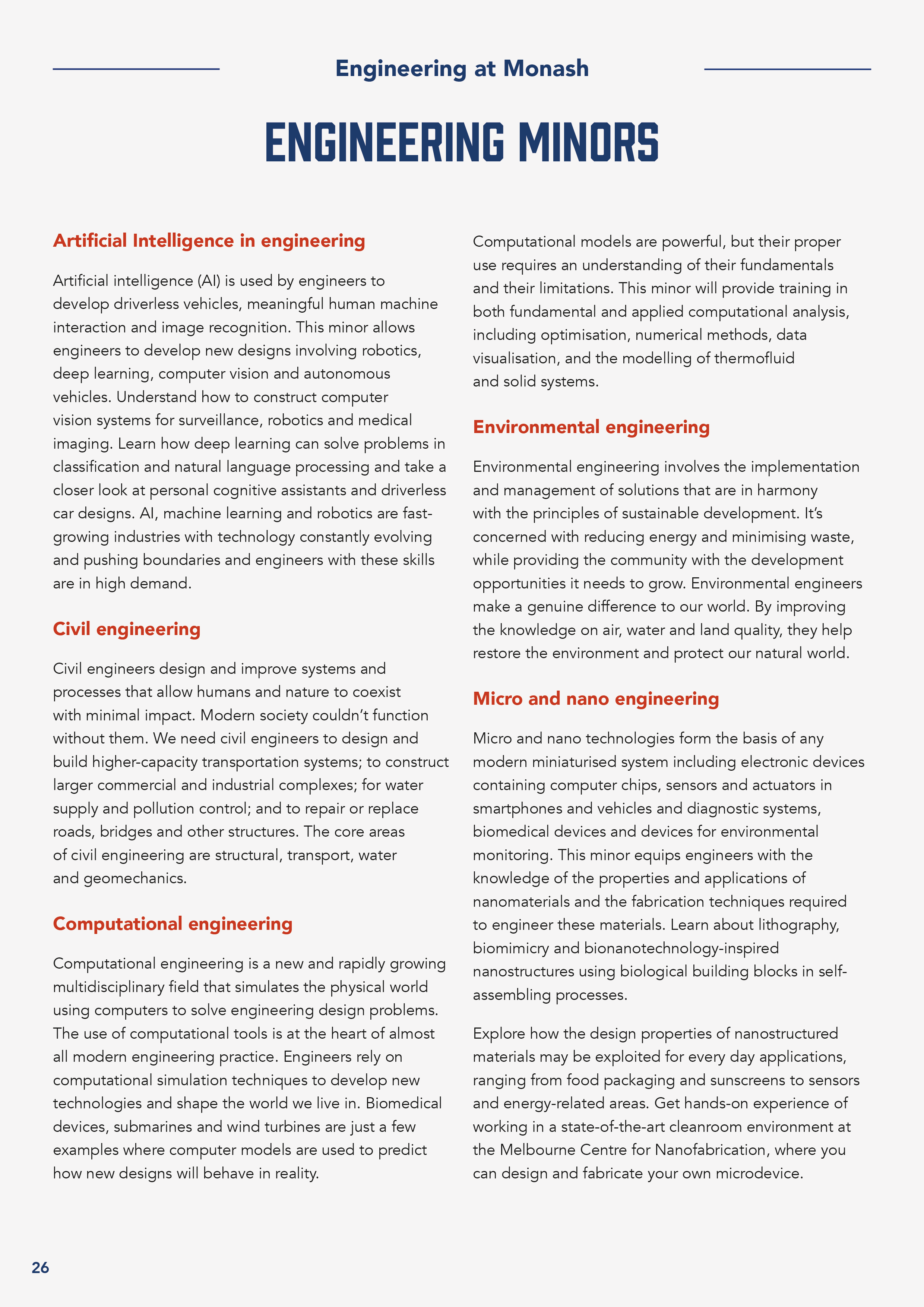 The Monash Engineering Careers Guide is an invaluable and comprehensive resource for past, current and future engineering students. It contains an in-depth look at each branch of engineering, academic advice, clubs, teams and societies, study abroad programmes, and application advice. The guide additionally features an extensive list of internships and full-time position opportunities available post-study.