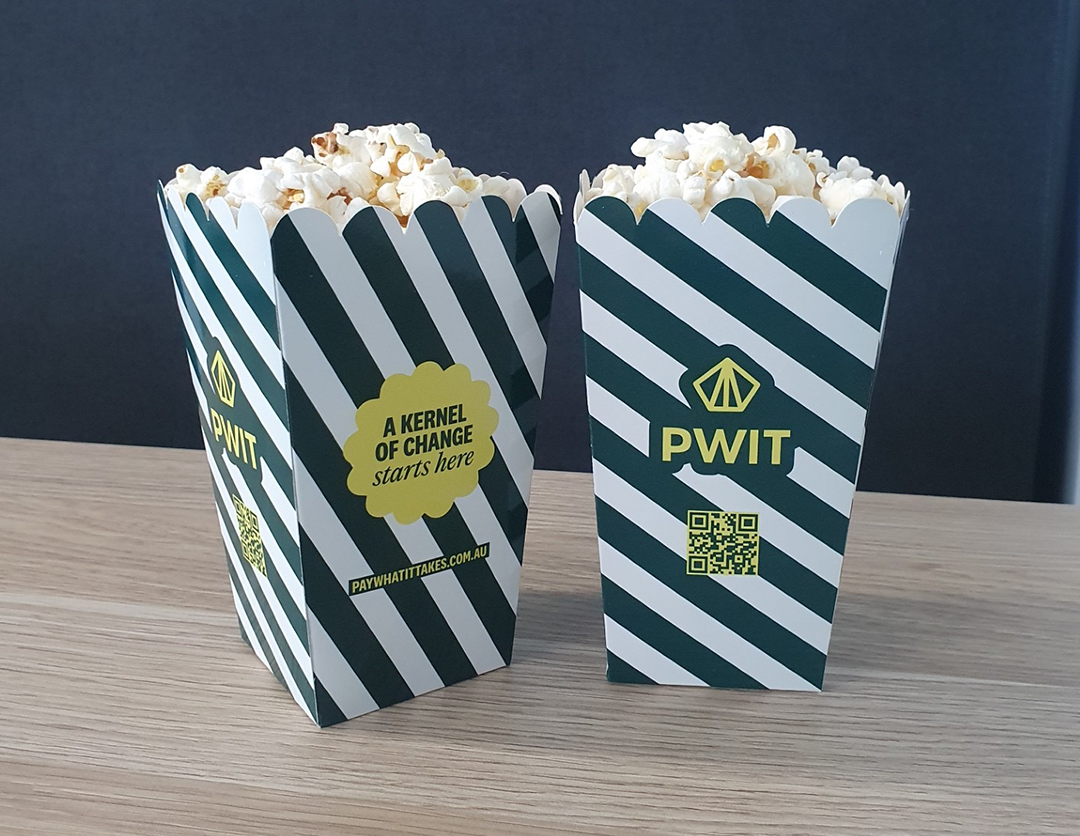 The final logo and brand package has since been applied to the PWIT website and social media profiles, including LinkedIn. The logo has also appeared on reports, digital greeting cards and on popcorn containers.